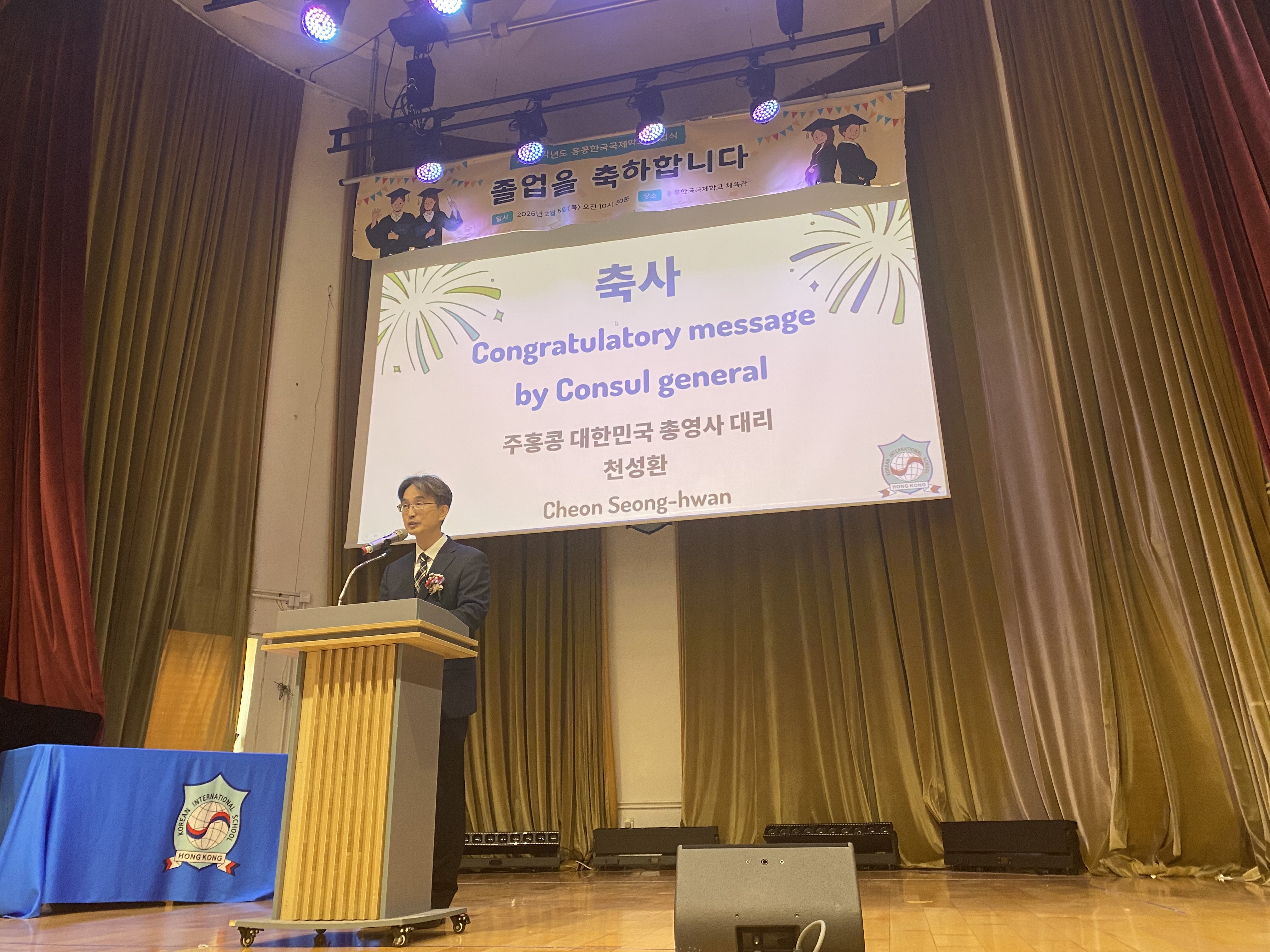천성환 총영사대리는 2026.2.5.(목) 2025학년도 홍콩한국국제학교 졸업식에 참석하여 졸업생 35명(유치원 6명, 초등부 9명, 중등부 14명, 고등부 6명)의 졸업을 축하하고, 새로운 출발을 응원하였습니다.